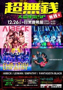 【#超無銭 大忘年会SP】 2023年12月21日 投稿者: 宮田 貴史 宮田 貴史 コメントがまだありません Calendar チケット カレンダーに追加 Timelyカレンダーに追加 Googleに追加 Outlookに追加 Appleカレンダーに追加 その他のカレンダーに追加 Export to XML いつ: 2023年12月26日 @ 4:00 PM 2023-12-26T16:00:00+09:00 2023-12-26T16:15:00+09:00 どこで: 目黒鹿鳴館 ◎先行各前売りチケット ※12/20 20:05〜 12月26日(火) 【#超無銭 大忘年会SP】 @目黒鹿鳴館 OPEN: 16:00 START:16:30 act. AIBECK LEIWAN EMPATHY #ファンタブラック ①Vチケット 5,000円(優先入場・宿題チェキ券) ②Gチケット 0円(予約必須) ③当日券2,900円(予約満枠の場合無し) 各1D別 投稿ナビゲーション FUKUIN-福音-(2部)【LEVEL4-man vo.112 大忘年会SP】
