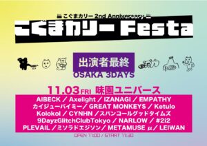 こぐまカリーFesta Day.1 2023年10月23日 投稿者: 宮田 貴史 宮田 貴史 コメントがまだありません Calendar チケット カレンダーに追加 Timelyカレンダーに追加 Googleに追加 Outlookに追加 Appleカレンダーに追加 その他のカレンダーに追加 Export to XML いつ: 2023年11月3日 @ 11:00 AM 2023-11-03T11:00:00+09:00 2023-11-03T11:15:00+09:00 どこで: 味園ユニバース 【大阪遠征解禁】 こぐまカリー2nd Anniversary 「こぐまカリーFesta」 11/3(金•祝)味園ユニバース t.livepocket.jp/e/yh4t9 ※発売は10/19(木)21:30〜 【出演者①】 AIBECK Axelight IZANAGI EMPATHY カイジューバイミー GREAT MONKEYS Ketulo Kolokol LEIWAN 他 投稿ナビゲーション 「LIVEアイドル最強盤」発売記念イベント【COMRIZED インストアイベント ミニライブ&特典会】