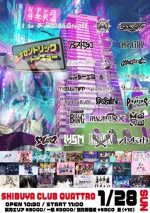 出演:I to U $CREAMing!!/AIBECK/アキストゼネコ/AZ-ON/alma/EMPATHY/美味しい曖昧/神薙ラビッツ/GANGDEMIC/シンダーエラ/SAISON/戦国アニマル極楽浄土/TELLMIT/点染テンセイ少女。/9DayzGlitchClubTokyo/PRSMIN/FANTASISTA BLACK/BELLRING少女ハート/Payrin’s/MAPA/MAD MEDiCiNE/MEWM/LYSM/LEIWAN/ヲドルマヨナカ/(50音順)