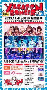 1部 YABATON BOMBER vo.2 @DEEP名古屋 栄 2023年11月2日 投稿者: 宮田 貴史 宮田 貴史 コメントがまだありません Calendar チケット カレンダーに追加 Timelyカレンダーに追加 Googleに追加 Outlookに追加 Appleカレンダーに追加 その他のカレンダーに追加 Export to XML いつ: 2023年11月4日 @ 10:30 AM 2023-11-04T10:30:00+09:00 2023-11-04T10:45:00+09:00 どこで: 名古屋DEEP栄 ◎先行前売りチケット販売 予約 11/1 20:30 〜 11月4日(土) 1部 YABATON BOMBER vo.2 @DEEP名古屋 栄 ①Sチケ5,000円:(囲み写メ&優先入場) ②Nチケ0円(予約必須) ③当日券2,900円 各1D別 10:30 OPEN 11:00 START act. AIBECK LEIWAN EMPATHY 入場順は①②③の順番となります。 投稿ナビゲーション 【NonStop 史上最高LIVE vo.6-無銭SP-】 @clubasia2部 YABATON BOMBER vo.3 @DEEP名古屋 栄
