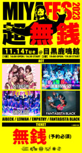 2部 【ミヤフェス2023】 @目黒鹿鳴館 2023年11月5日 投稿者: 宮田 貴史 宮田 貴史 コメントがまだありません Calendar チケット カレンダーに追加 Timelyカレンダーに追加 Googleに追加 Outlookに追加 Appleカレンダーに追加 その他のカレンダーに追加 Export to XML いつ: 2023年11月14日 @ 7:00 PM 2023-11-14T19:00:00+09:00 2023-11-14T19:15:00+09:00 どこで: 目黒鹿鳴館 11/3 23:00 〜開始 11/14(火) 2部 【ミヤフェス2023】 @目黒鹿鳴館 OPEN: 19:00 START:19:30 act. AIBECK LEIWAN EMPATHY #ファンタブラック ①Vチケット 5,000円 囲み写メ 優先入場 ②Gチケット 0円(予約必須) ③当日券2,900円(予約満枠の場合無し) 各1D別 入場順は①②③の順番となります。 投稿ナビゲーション 1部 【ミヤフェス2023】 @目黒鹿鳴館猫乃ねむ子選抜メンバー組閣祭り in 目黒鹿鳴館【1部:LEIWAN 猫乃ねむ子 生誕祭】